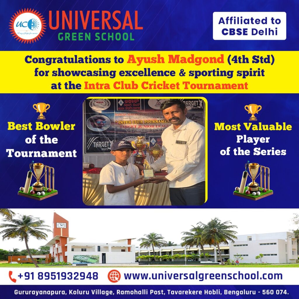 We are thrilled to announce the remarkable achievements of Ayush Madgond, a proud 4th Standard student of Universal Green School, who recently stole the spotlight at the Intra Club Cricket Tournament. Ayush’s exceptional talent and sporting spirit earned him two prestigious awards: