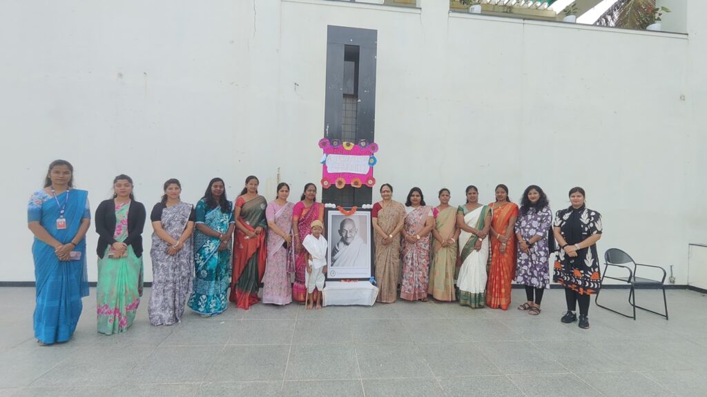 The day began with a solemn floral tribute to Gandhi’s portrait, symbolizing his values and principles. Teachers, dressed in vibrant sarees, stood united in front of the portrait as a mark of respect. The presence of a young student, dressed as Gandhi, added a touch of innocence and hope for a future shaped by Gandhian ideals.